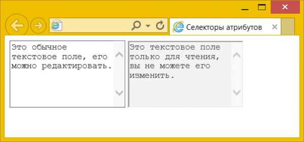В данном примере селектор textarea устанавливает стиль для всех элементов <textarea>, а селектор textarea[readonly] для элементов <textarea>, к которым добавлен атрибут readonly. Результат примера показан на рис. 1.