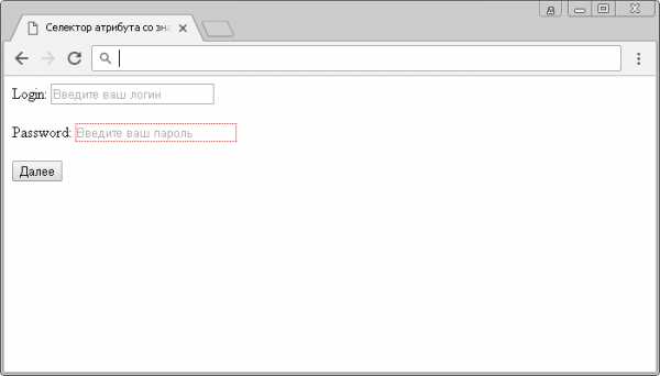 В этом примере мы использовали два селектора атрибутов с указанным значением, которые позволили нам выбрать поле, предназаченное для ввода пароля, а во втором случае с использованием псевдокласса :focus мы создали стили для того состояния, когда это поле находится в фокусе (пользователь кликнул на него, или выбрал с помощью клавиатуры).