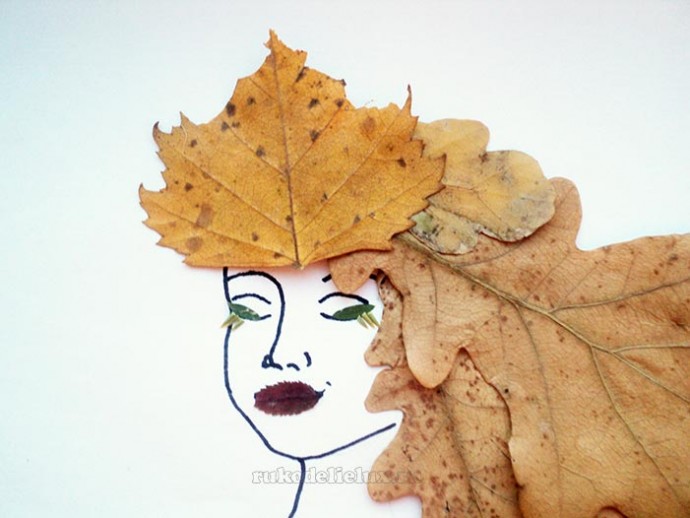 Суть в том, чтобы вырезать из разных листьев подходящие фигуры и как можно аккуратнее заполнить прическу в технике мозаики внутри обозначенного карандашом контура. Это уже искусная аппликация из природного материала, и увлечь она может даже взрослого. Поменьше растрепанности! Пусть фрагменты листьев станут мазками уверенной кисти.