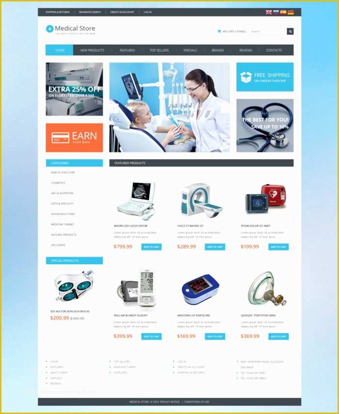 Дизайн OSMART идет прямо к делу, продавая товары прямо с главной страницы. Он имеет восемь цветных скинов, поддерживает несколько валют и включает многослойные PSD-файлы.