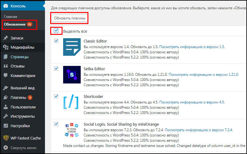 Обновите сразу все темы и плагины, которые содержаться в разделе «Обновления» в админке WordPress. Выделяем все объекты и нажимаем Обновить. Ту же процедуру проводим с темами.